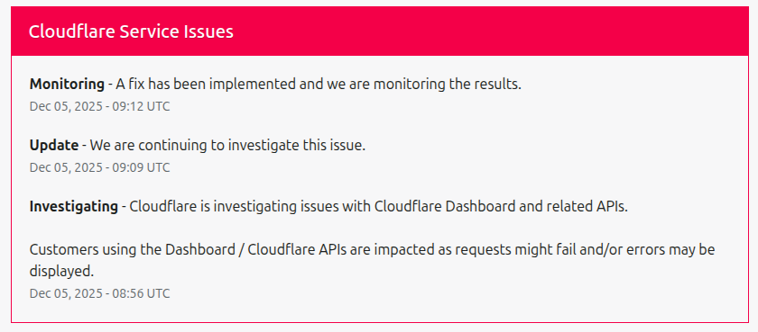 - Investigating – Cloudflare is investigating issues with the Cloudflare Dashboard and related APIs. Customers using the Dashboard / Cloudflare APIs are impacted as requests may fail and/or errors may be displayed. (Dec 05, 2025 – 08:56 UTC)